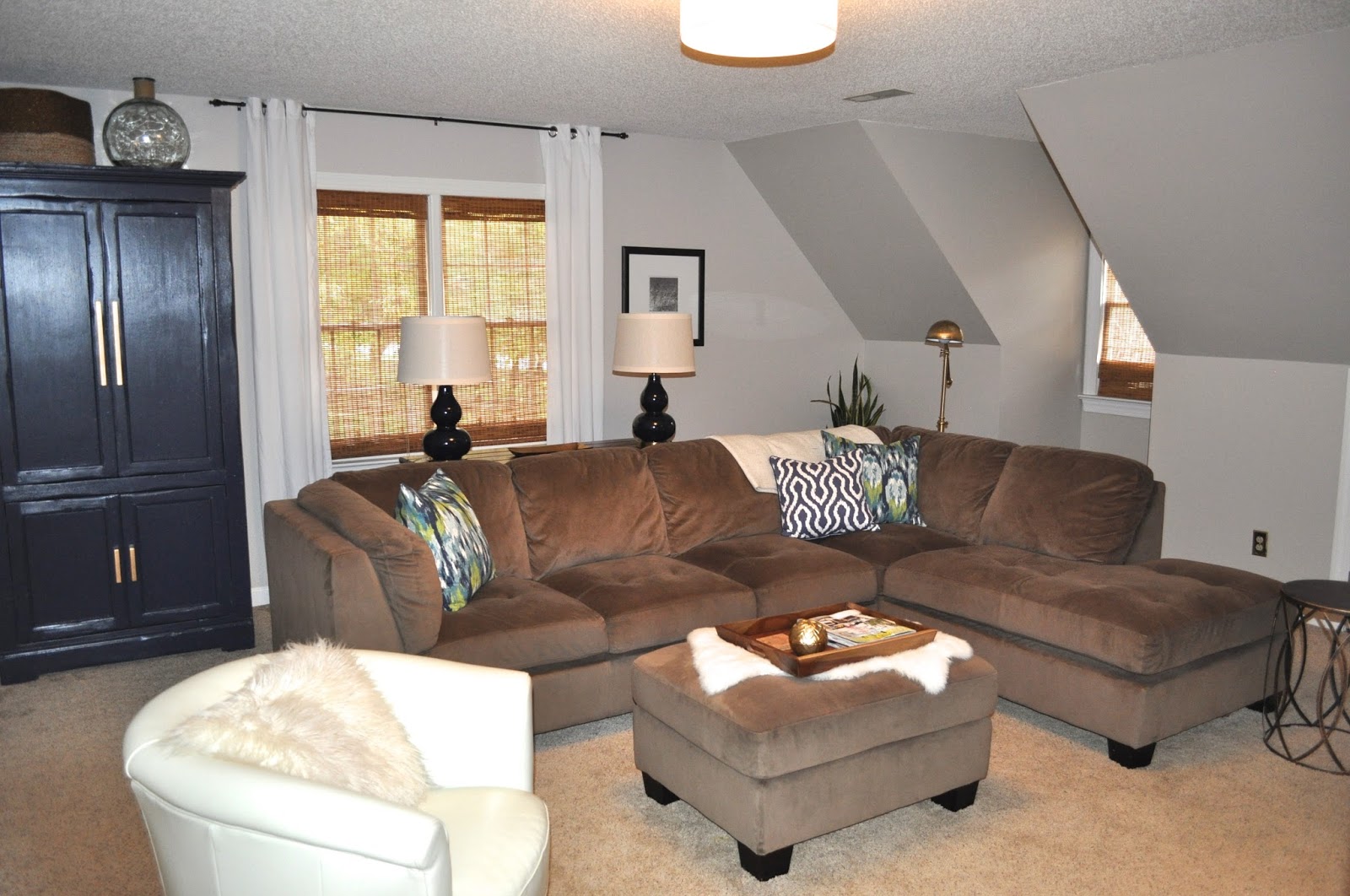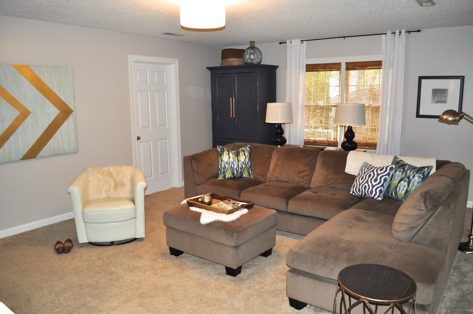 If you'll remember this is our bonus room where our kids mainly hang out with their friends and play video games. And our entire family watches movies together in this space as well. In it's before state, it really was just a hodge podge of leftover pillows and art. I actually got a head start on this makeover over the Summer when we had the walls painted a nice light gray.