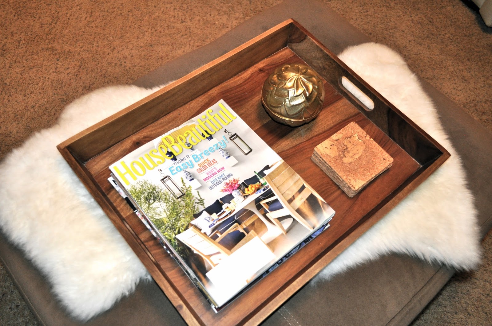 This simple tray makes our ottoman function as a coffee table, I love that!