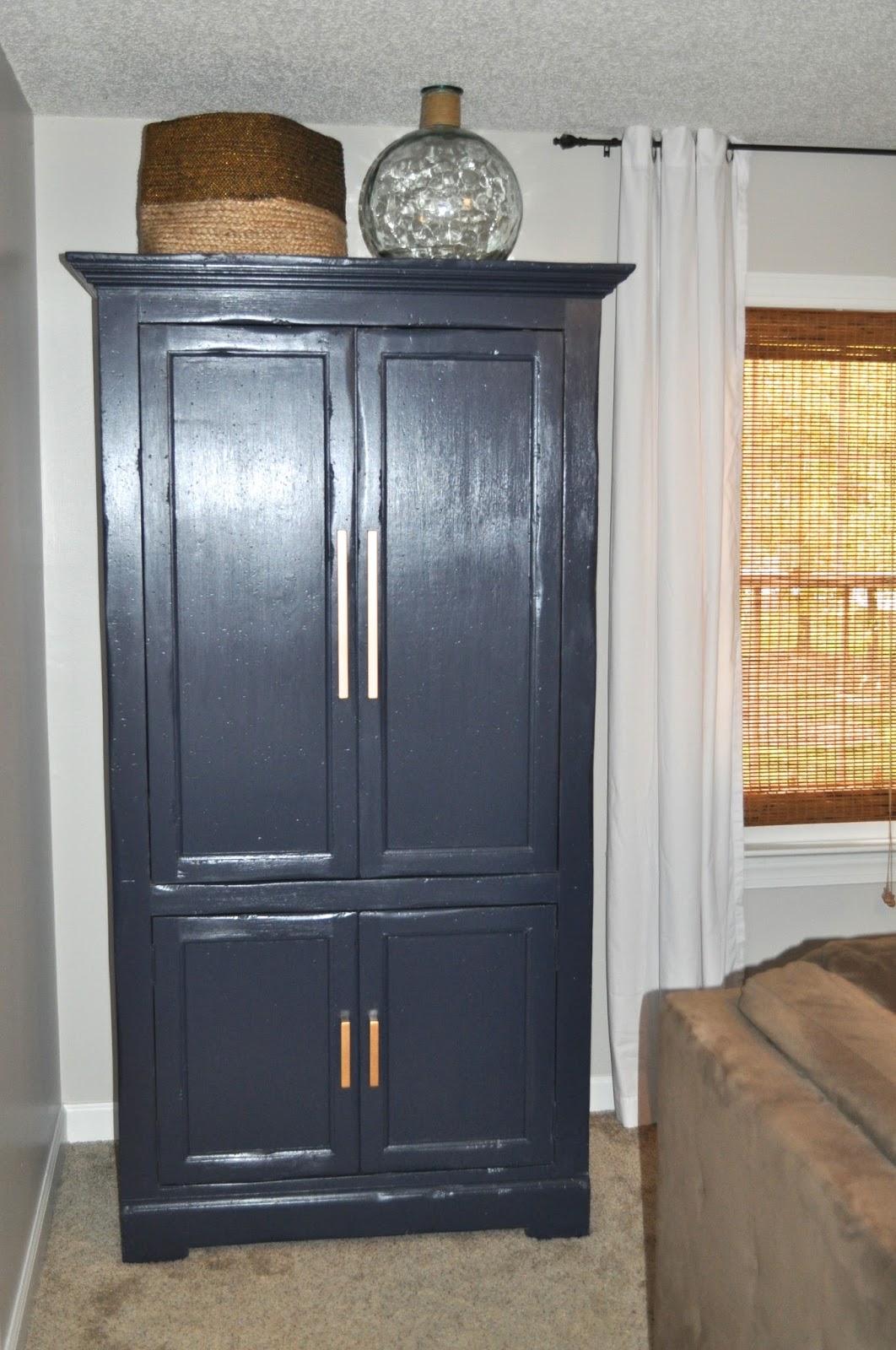 Check out my Diy painted armoire! The color is Hale Navy by Benjamin Moore. It's a great navy, not too dark or light and has a gray undertone. And adding new Ikea hardware to the armoire instantly gave it a more modern and updated feel. The pulls originally were silver. I gave them a coat of spray paint with Krylon's Metallic Gold. And new accessories above the armoire gave this old piece new life. This is my favorite part of the entire makeover since the hubby and I bought this piece nearly 20 years ago when we were first married!